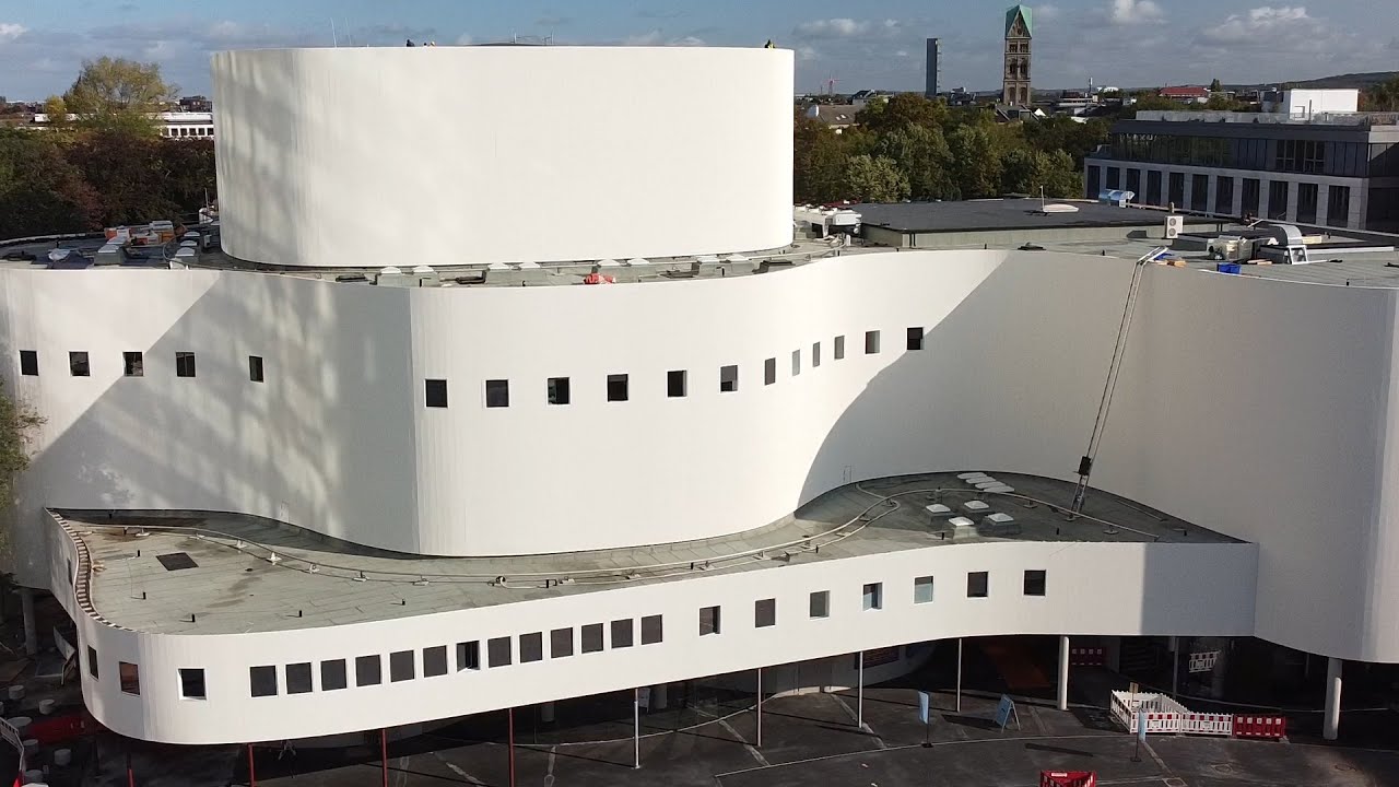 Es ist soweit: Das Düsseldorfer Schauspielhaus erstrahlt im neuen Glanz. Das architektonisch herausragende Bauwerk ist wieder komplett von seiner charakteristischen weißen Fassade umhüllt.